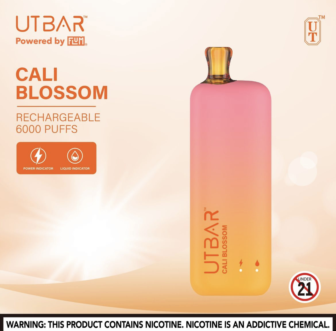UTBAR 6000 是 Flum 旗下推出的一款高口数一次性电子烟,整体设计融合了 Flum Float 与 Flum Pebble 的外观风格,在保持简洁手感的同时增加了更多实用功能。整机结构紧凑,圆润的机身设计握持舒适,日常携带也比较方便。